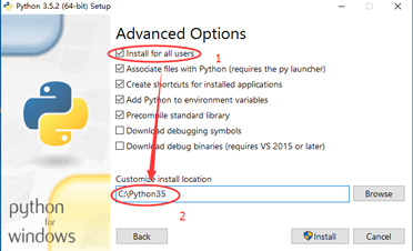 此处勾选“Install for all users" 并自定义安装路径为"C:\Python35"