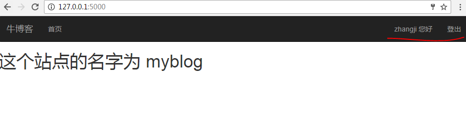 之后,就可以方便的使用flask-login框架,继续修改首页模板的导航部分,以便显示用户名及相应信息: