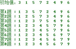 在要排序的一组数中,对当前还未排好序的范围内的全部数,自上而下对相邻的两个数依次进行比较和调整,让较大的数往下沉,较小的往上冒。即:每当两相邻的数比较后发现它们的排序与排序要求相反时,就将它们互换。
