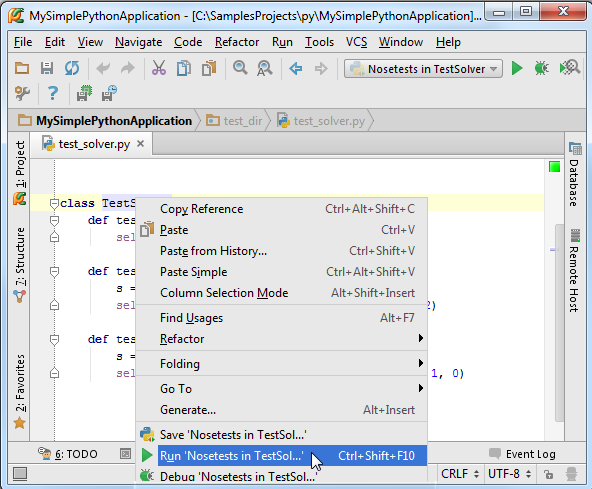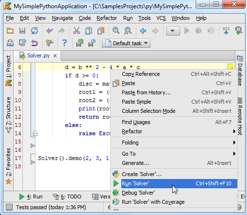 打开之前编写的Solver.py文件,在编辑框中右键,选择快捷菜单中的“Run 'Solver'”选项。