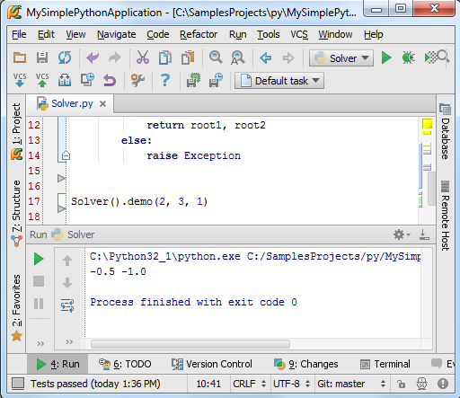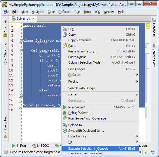 打开Solver.py文件(打开的方法多种多样,例如Ctrl+E - View → Recent Files),全选文件中的代码内容(Ctrl+A, or Edit → Select All),然后按下Alt+Shift+E(或者右击在弹出的快捷菜单中选择Execute Selection in Console):