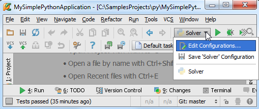 如果你仔细观察第一张图片就会发现,在组合框中根本就没有 run/debug的相关信息,知道第二张图片中它们才出现。这就意味着当执行运行/调试命令的时候,Solver脚本的run/debug配置文件才会自动生成,正如现在所显示的这样。