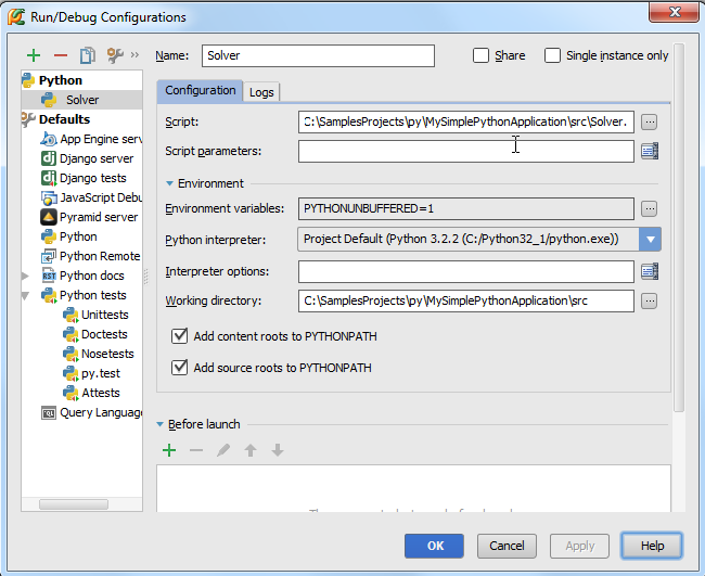 在左侧目录中将会出现两个节点:Python和Default。在第一个节点目录下有一个单一的配置选项'Solver',在第二个选项下则有很多配置信息。