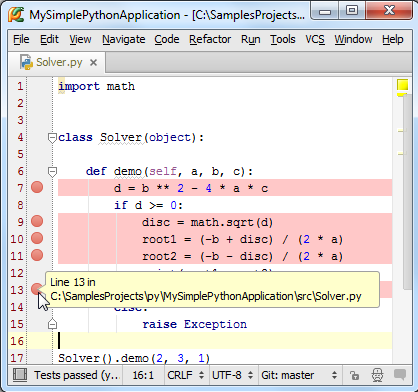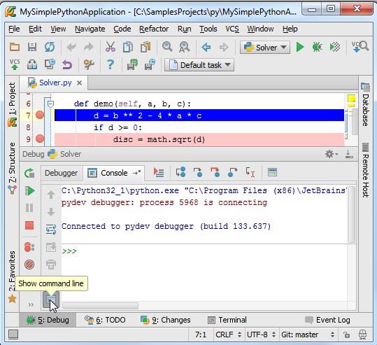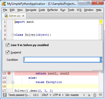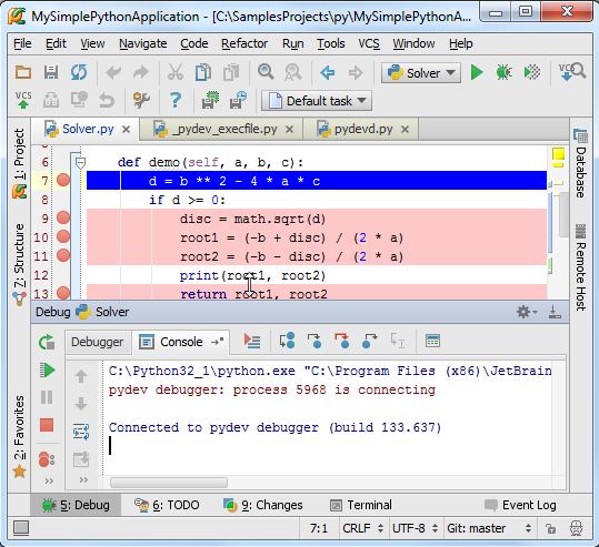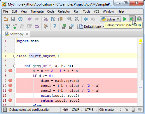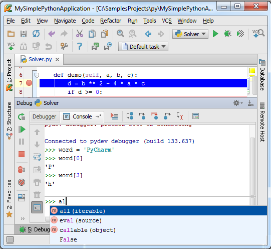 在Pycharm中我们可以在其中直接对程序进行调试,唯一需要做的准备工作就是在程序必要的地方加设断点,接下来我们进行详细的介绍: