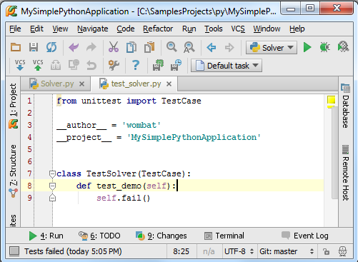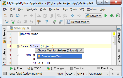 首先我们创建一个test实例。Pycharm提供了一种非常智能的创建测试代码的方法:单击选中类名然后按下Ctrl+Shift+T快捷键,或者在主菜单中选择Navigate → Test,如果test程序已存在,则会直接跳转到对应代码,否则创建它: