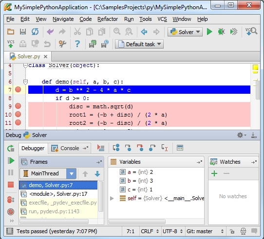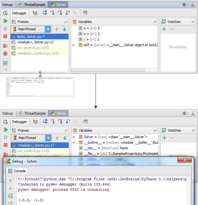 OK,现在程序暂停在了第一断点处,Frames窗口显示的是Solver脚本的第7行代码所对应的进程demo,相关变量a、b、c已经定义,但变量d尚未进行定义。接下来?