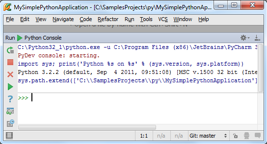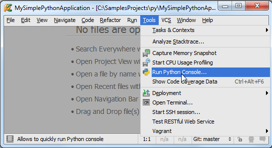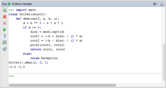 最后,如果你更习惯工作于控制台环境下,也可以将Pycharm设置成为控制台模式。在主菜单中选择Tools → Run Python Console...来加载控制台: