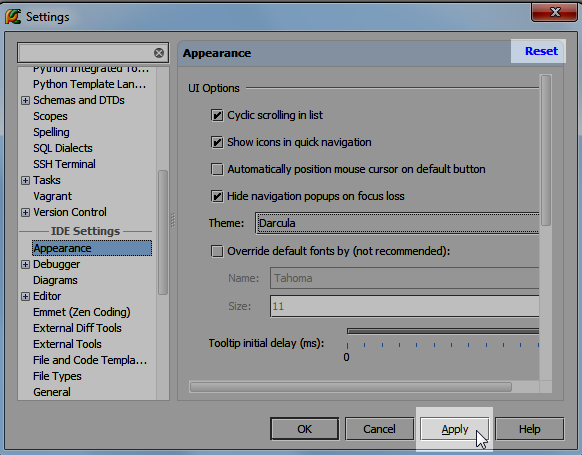 注意此时位于对话框右上角的Reset按钮,如果你改变了注意,可以通过单击这个按钮来恢复之前的设置。同时当你将鼠标移动至Apply按钮时,它将变为可用状态: