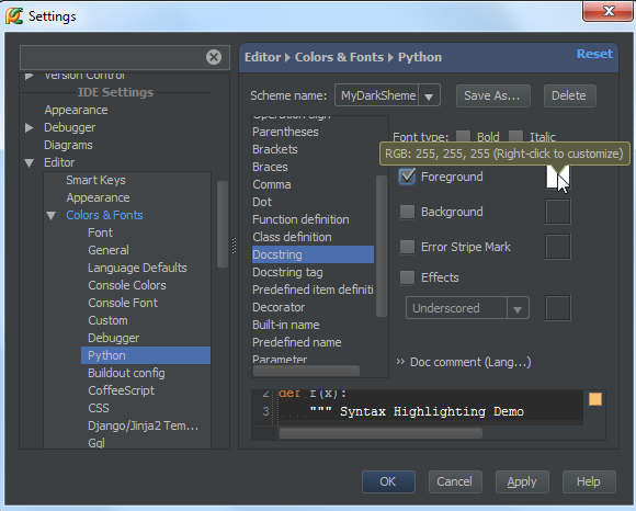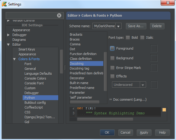 在更改完Pycharm的主题背景之后,你可能对编辑器的外观仍不满意,例如你希望将文档字符串改变为另外一种颜色,下面介绍具体更改方法: