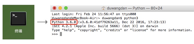 3. 打开Mac终端,输入“python3”,回车,查看是否是自己装的Python版本(如果Mac系统版本是10.8—10.11,默认自带的是Python2.7)。输入Python3后,看到显示【>>>】,说明已经在Python的交互环境中了,可以正常使用。