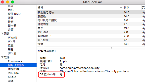 点击【左上角的苹果图标——关于本机——系统报告——偏好设置面板】,查看是32位还是64位。
