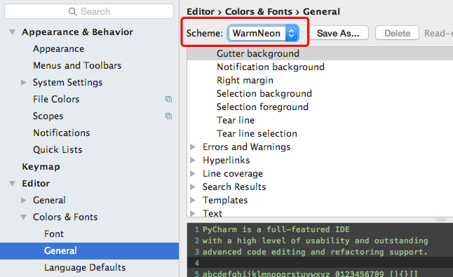 3. 默认的颜色字体等如果觉得不合适,可以在【PyCharm——Preferences——Editor——Colors&Fonts】中进行修改。默认的编辑区域是白色的,如果想改成其他颜色的话可以在【General】中进行更换。