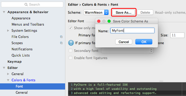 默认的字体比较小,如果需要大一点的话,在【Font】操作界面中是不能修改的,需要先Save As一个自己的字体主题,然后变更大小。