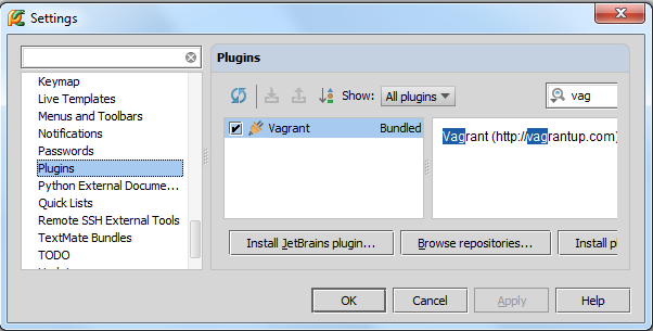 确保Pycharm的Vagrant插件可用:单击主工具栏中的设置按钮,在设置对话框中打开 Plugins页面,显示插件默认可用: