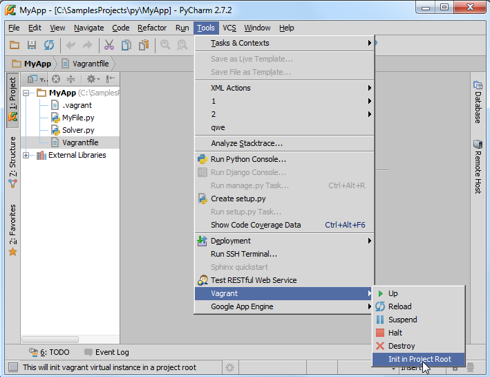 一旦创建了Vagrant box,就需要在工程存根下对其进行初始化。在主菜单上单击Tools | Vagrant,选择 Init in Project Root: