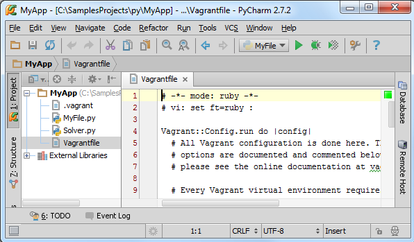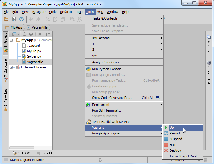 注意Tool 菜单下的Vagrant 命令,这个命令与标准的Vagrant行为相关联。