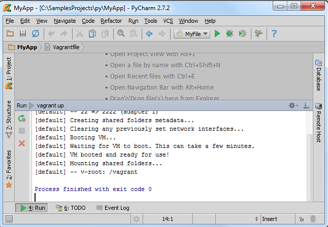 Pycharm会自动运行vagrant up 命令,并在控制台界面显示输出结果: