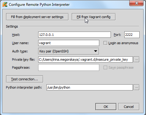 在Configure Remote Python Interpreter 对话框中,需要进行服务器配置。这些设置可以手动设定,也可以从已经定义好的Vagrant配置文件中导入,在这里我们选择第二个方式。 单击 Fill from Vagrant configuration按钮,将会根据配置文件的内容自动填充相关设置属性值: