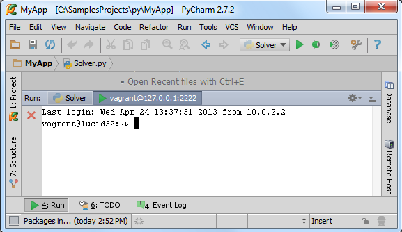 在主菜单中选择Tools | Run SSH Terminal,如果你定义了不止一个主机(host),则选择一个你想要建立链接的(我们这里选择远程解释器):