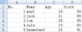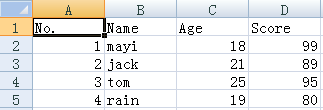 No.,Name,Age,Score 1,mayi,18,99 2,jack,21,89 3,tom,25,95 4,rain,19,80