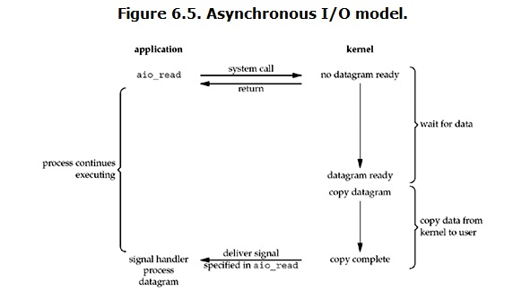 用户进程发起read操作之后,立刻就可以开始去做其它的事。而另一方面,从kernel的角度,当它收到一个asynchronous read之后,首先它会立刻返回,所以不会对用户进程产生任何block。然后,kernel会等待数据准备完成,然后将数据拷贝到用户内存,当这一切都完成之后,kernel会给用户进程发送一个signal,告诉它read操作完成了。