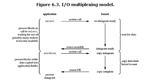 这个图和blocking IO的图其实并没有太大的不同,事实上,还更差一些。因为这里需要使用两个system call (select 和 recvfrom),而blocking IO只调用了一个system call (recvfrom)。但是,用select的优势在于它可以同时处理多个connection。(多说一句。所以,如果处理的连接数不是很高的话,使用select/epoll的web server不一定比使用multi-threading + blocking IO的web server性能更好,可能延迟还更大。select/epoll的优势并不是对于单个连接能处理得更快,而是在于能处理更多的连接)