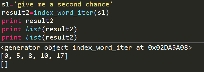 需要注意的是:函数返回的迭代器,只能产生一轮结果,如果继续迭代第二轮,是不会再有结果的。