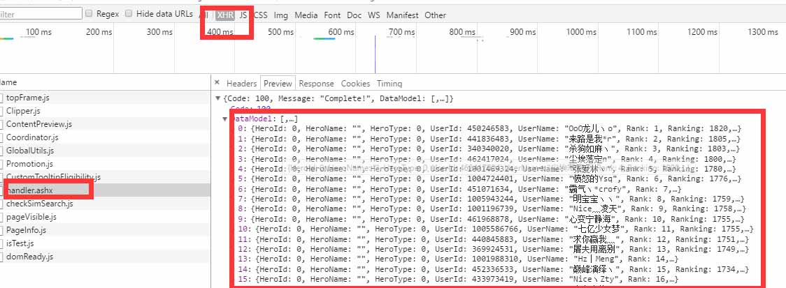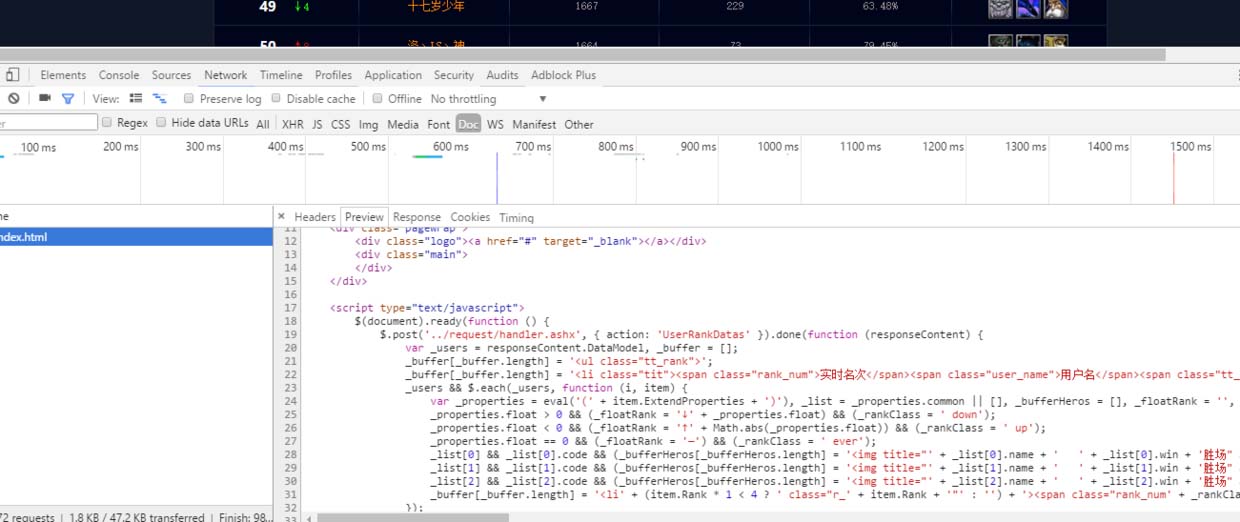 打开开发者工具,我们观察到排行榜的数据并没有在doc里