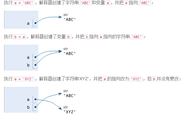 >>> a = 'ABC' >>> b = a >>> a = 'XYZ' >>> print a b 'XYZ' 'ABC'