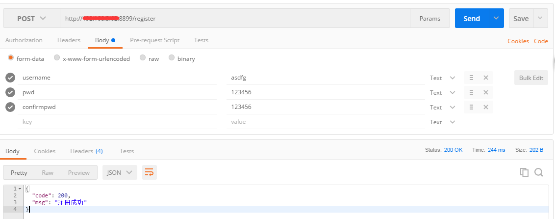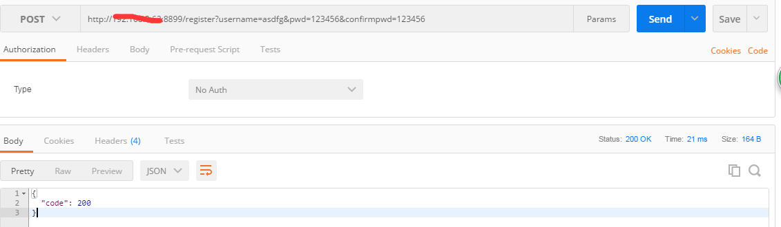 打开浏览器,输入urlhttp://127.0.0.1:5000/xxx,后面跟上接口的地址register,参数使用postman或jmeter进行请求,参数类型是json。请求成功,则返回{'code': 200, 'message': '登录成功'}。
