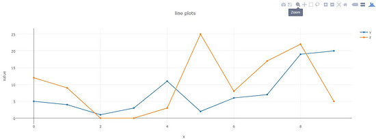 layout = Layout(title="line plots", xaxis={'title':'x'}, yaxis={'title':'value'})