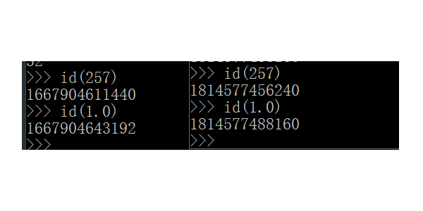 >>> id(True) 1538937056 >>> id(False) 1538937088 >>> id(False) - id(True) 32 >>> id(-5) 1539416992 >>> id(-6) 1667933956912 >>> id(-4) 1539417024 >>> id(-4)-id(-5) 32 >>> id(-3)-id(-4) 32 >>> id(-3) 1539417056 >>> id(-2) 1539417088 >>> id(-2) - id(-3) 32 >>> id(255) 1539425312 >>> id(256) 1539425344 >>> id(256) - id(255) 32 >>> id(257) 1667904611440 >>> id(1.0) 1667904643192