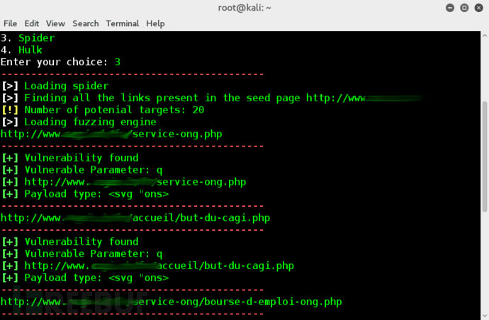 4. Hulk: 使用了一种不同寻常的方式,直接无视掉输入所对应的网页内容变化。其有一个 polyglots 列表以及可靠的payload,它会逐一在目标参数中键入并在浏览器窗口中打开这些组合URL