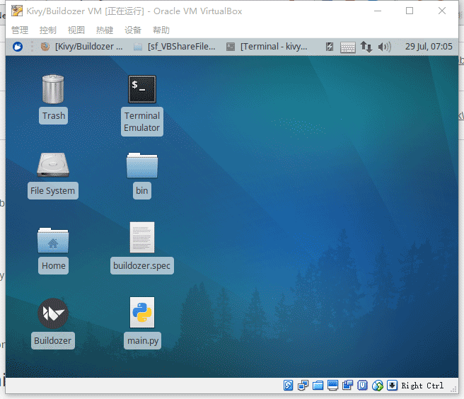 首先需要安装虚拟机 VirtualBox,这个没问题,很快就装好了,然后Kivy官方制作了该虚拟机的映像(很体贴),下载后就直接能运行了,省去不少麻烦。下载地址,或者直接去官网下载: