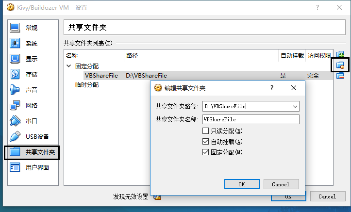 然后我们使用固定分配,在windows下某个路径新建一个文件夹后将其选择为共享文件夹,并选择自动挂载: