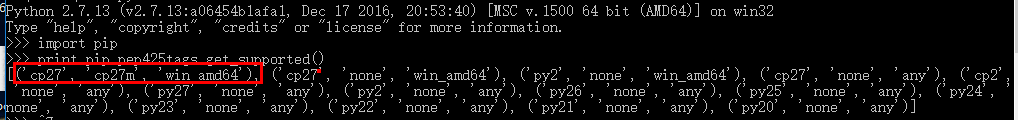 进入cmd——>import pip——>print pip.pep425tags.get_supported(),按照截图中三项进行选择