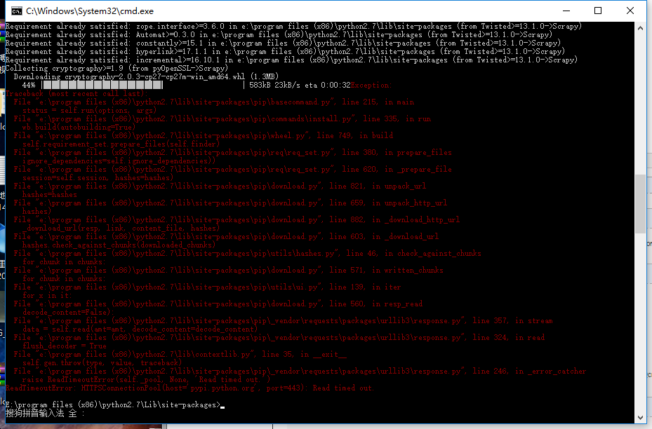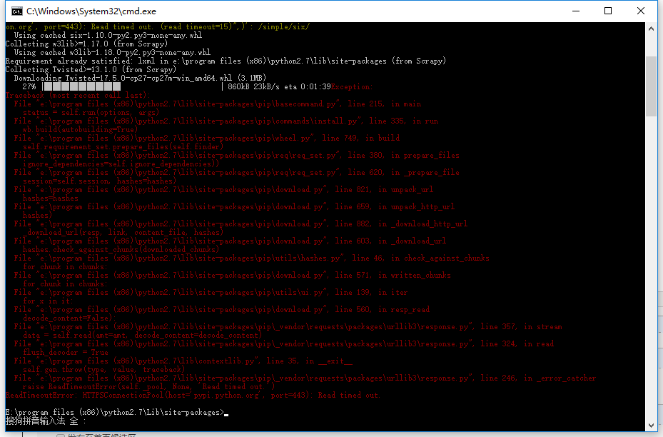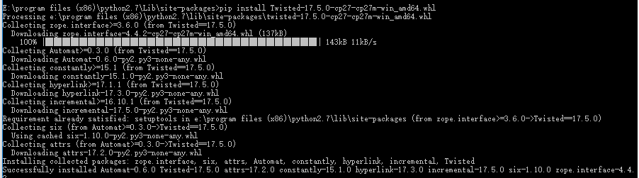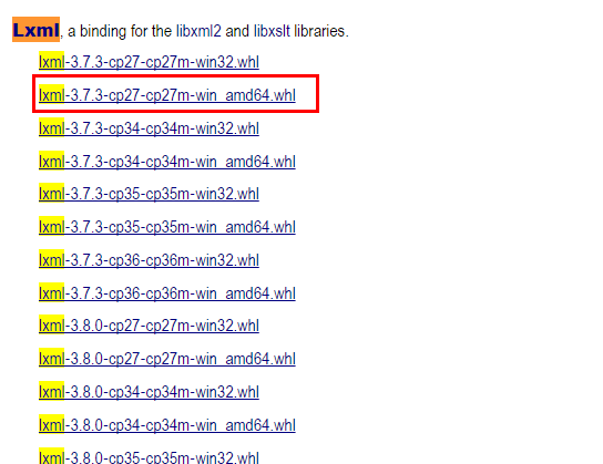 下载后执行whl文件,pip install lxml‑3.7.3‑cp27‑cp27m‑win_amd64.whl