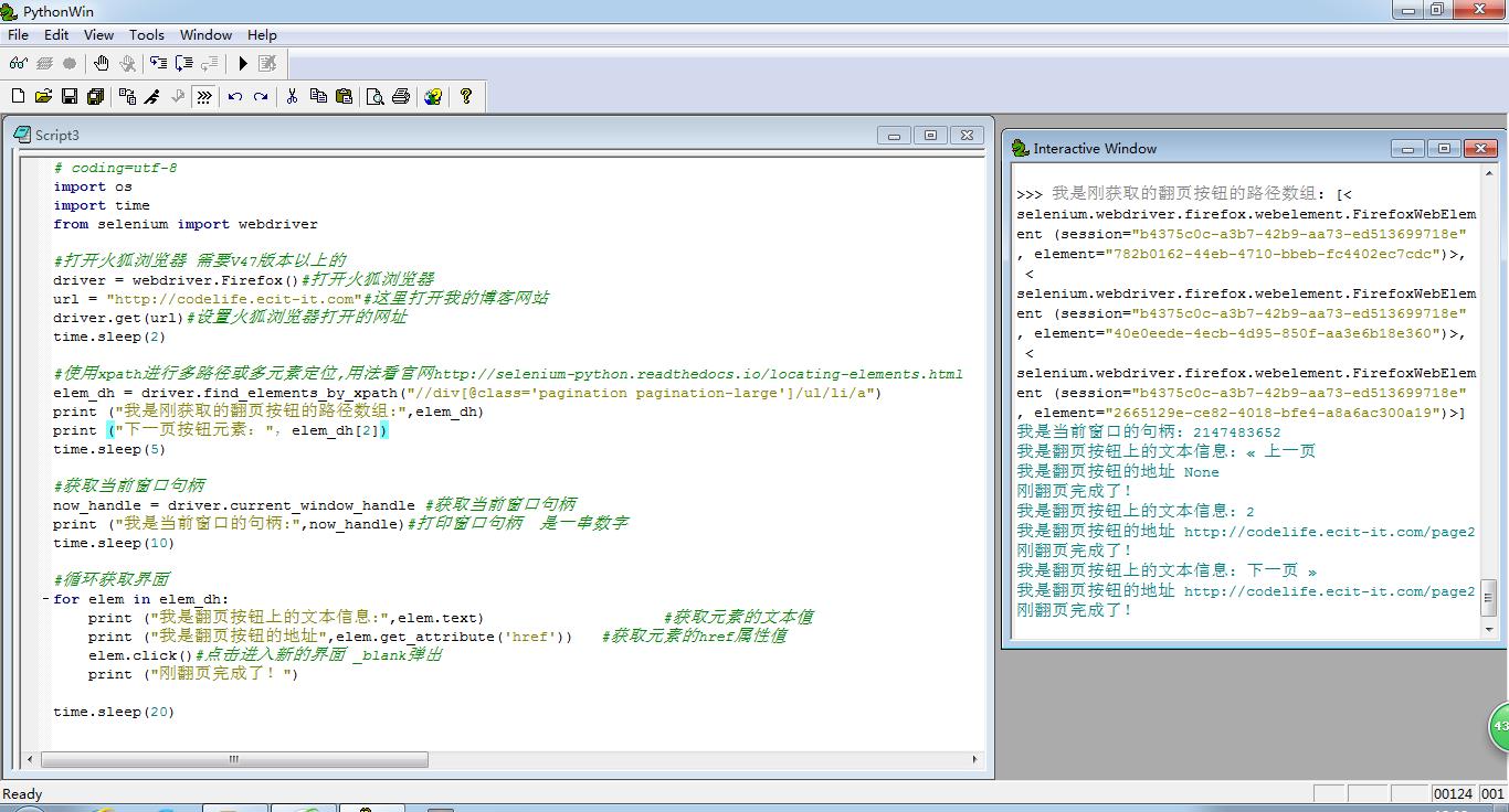 >>> 我是刚获取的翻页按钮的路径数组: [<selenium.webdriver.firefox.webelement.FirefoxWebElement (session="b4375c0c-a3b7-42b9-aa73-ed513699718e", element="782b0162-44eb-4710-bbeb-fc4402ec7cdc")>, <selenium.webdriver.firefox.webelement.FirefoxWebElement (session="b4375c0c-a3b7-42b9-aa73-ed513699718e", element="40e0eede-4ecb-4d95-850f-aa3e6b18e360")>, <selenium.webdriver.firefox.webelement.FirefoxWebElement (session="b4375c0c-a3b7-42b9-aa73-ed513699718e", element="2665129e-ce82-4018-bfe4-a8a6ac300a19")>] 我是当前窗口的句柄: 2147483652 我是翻页按钮上的文本信息: « 上一页 我是翻页按钮的地址 None 刚翻页完成了! 我是翻页按钮上的文本信息: 2 我是翻页按钮的地址 http://codelife.ecit-it.com/page2 刚翻页完成了! 我是翻页按钮上的文本信息: 下一页 » 我是翻页按钮的地址 http://codelife.ecit-it.com/page2 刚翻页完成了!