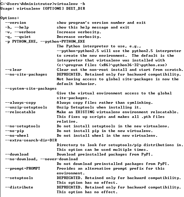 --no-site-packages:不使用系统环境的python安装包,即隔离包中不能使用真实python环境的安装包;当前版本这个选项是默认的。