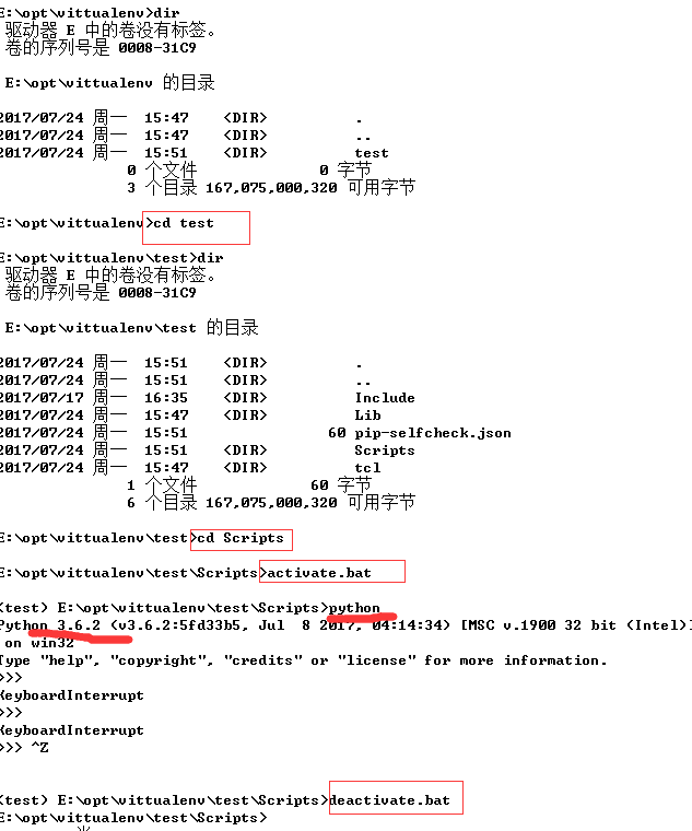 virtualenv test,使用该命令在指定的路径下创建Python环境,默认与系统环境一致。如果想要进入该虚拟环境则要进入test/Scripts/文件夹下,运行activate.bat,在Linux下在bin目录下,运行命令为source xx/xx/activate退出命令为deactivate.bat