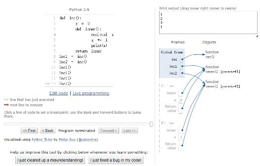 上述代码中inc1和inc2各自有一块封闭起来的作用域,可以通过Online Python Tutor 可视化运行工具看相应的运行结果