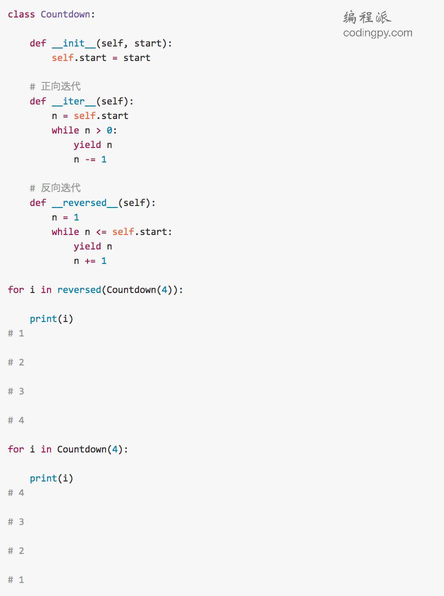 除此以外,还可以通过实现类里的__reversed__方法,将类进行反向迭代: