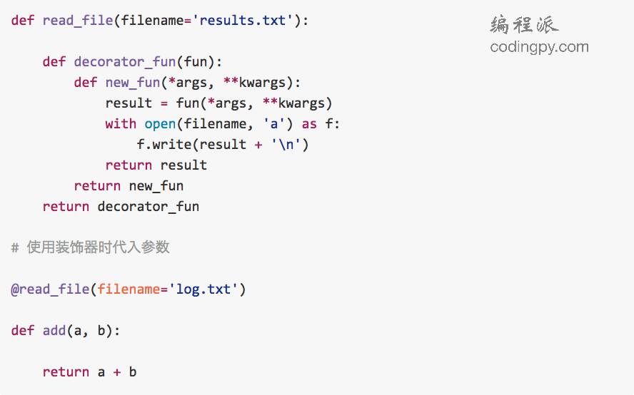 除此以外,还可以编写接收参数的装饰器,其实就是在原本的装饰器上的外层又嵌套了一个函数: