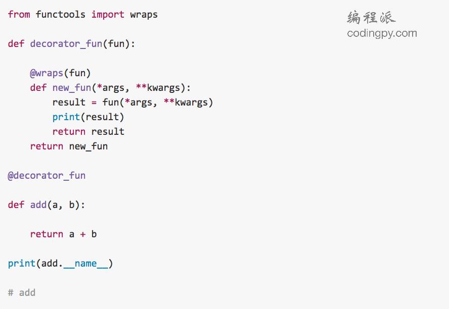 functools.wraps是个很 hack 的方法,它本事作为一个装饰器,做用在装饰器内部将要返回的函数上。也就是说,它是装饰器的装饰器,并且以原函数为参数,作用是保留原函数的各种信息,使得我们之后查看被装饰了的原函数的信息时,可以保持跟原函数一模一样。
