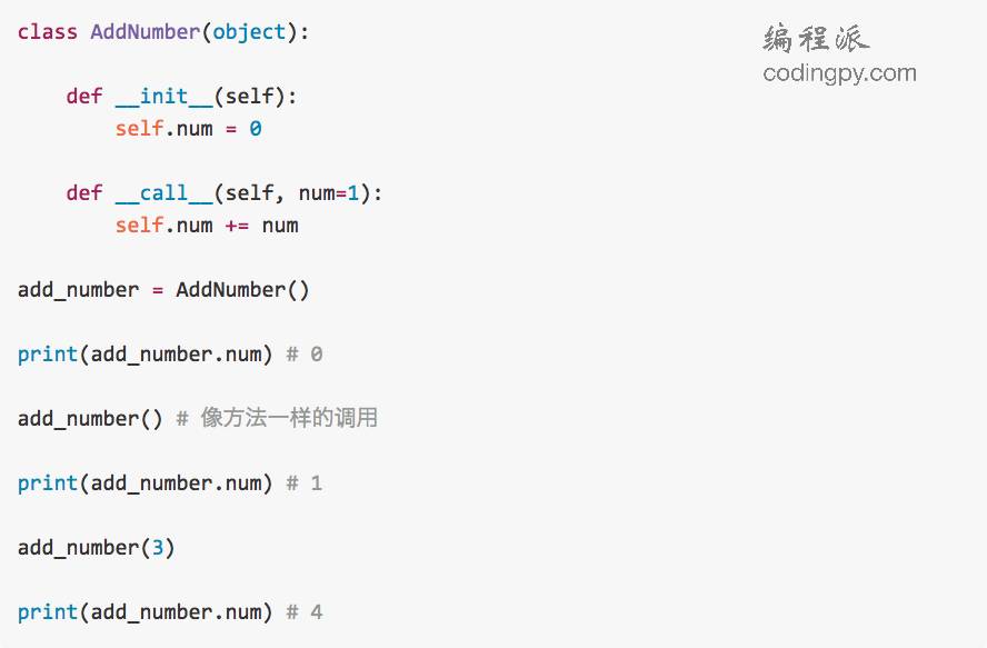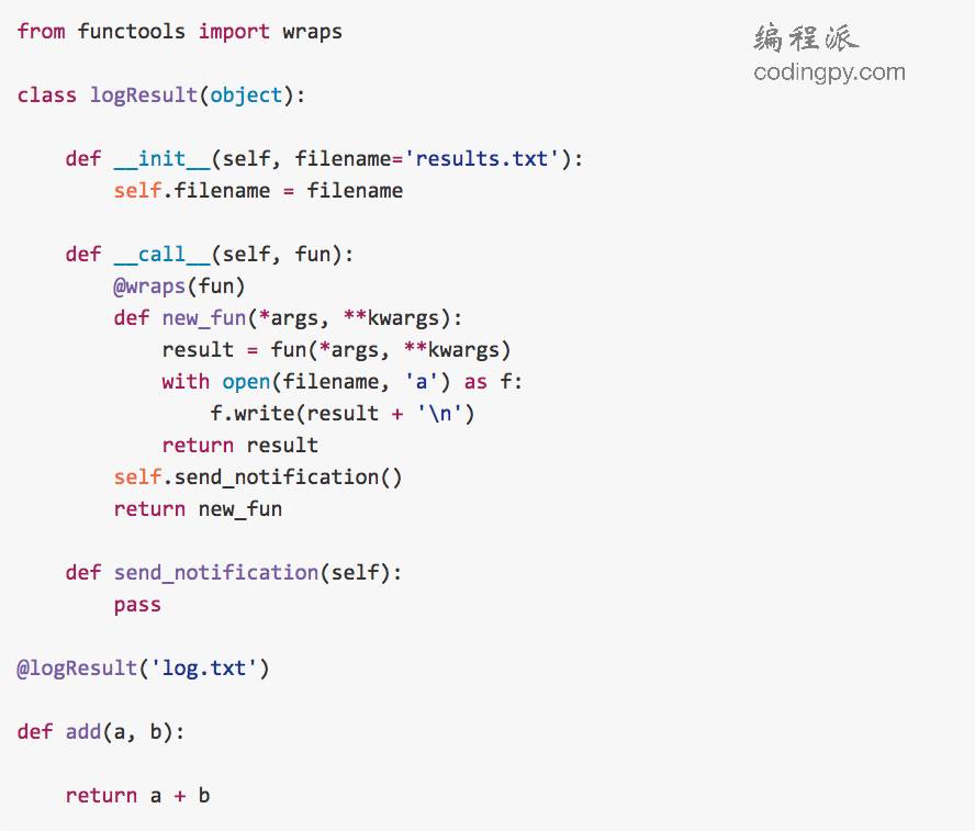 此外,有时候我们的装饰器里可能会干不止一个事情,此时应该把事件作为额外的函数分离出去。但是又因为它可能仅仅和该装饰器有关,所以此时可以构造一个装饰器类。原理很简单,主要就是编写类里的__call__方法,使类能够像函数一样的调用。