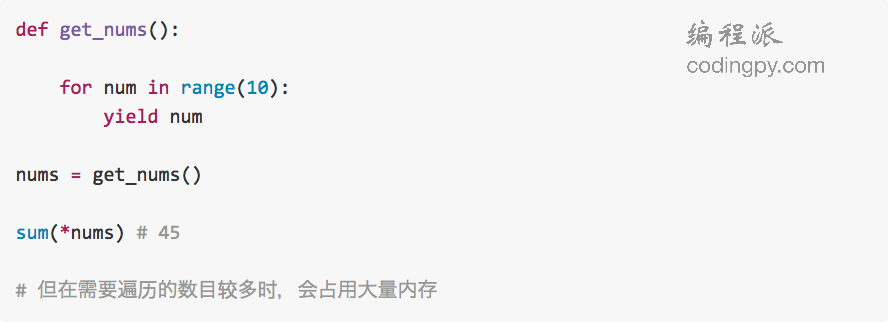 但要注意的是,不定长度的参数args在传递给函数时,需要先转换成元组tuple。这意味着,如果你将一个生成器作为参数带入到函数中,生成器将会先遍历一遍,转换为元组。这可能会消耗大量内存: