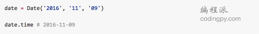 上述代码创建了Date类,该类会在初始化时设置day/month/year属性,并且通过property设置了一个getter,可以在实例化之后,通过time获取存储的时间: