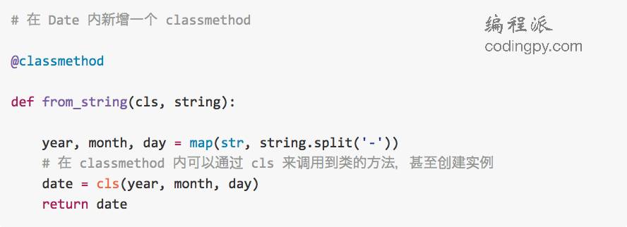 这样,我们就可以通过Date类来调用from_string方法创建实例,并且不侵略、修改旧的实例化方式: