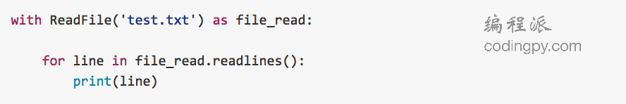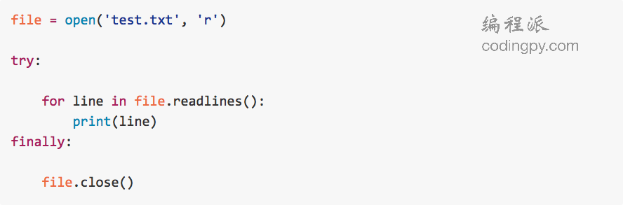 通过with语句,代码完成了文件打开操作,并在调用结束,或者读取发生异常时自动关闭文件,即完成了文件读写之后的处理工作。如果不通过上下文管理器的话,则会是这样的代码: