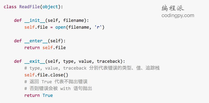 要注意的是,在__exit__方法内,我们关闭了文件,但最后返回True,所以错误不会被with语句抛出。否则with语句会抛出一个对应的错误。